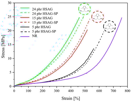Stress-strain curves of vulcanized NR-based composites containing either HSAG or HSAG-SP. The number of each composite is close to the corresponding curve. Moreover, the chemical structure of serinol pyrrole is shown close to the curves of composites based on HSAG-SP.