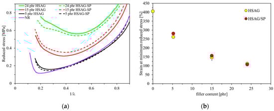 As far as the strain at break is concerned, the results in Figure 5 and Table 5 are in line with those reported in the literature, although the level of filler content here explored is much larger. In most literature works based on composites from NR latexes, the strain at break was found to decrease, to a different extent, with the content of GRM, by using thermally [] or chemically [] reduced graphene oxide, mechanically exfoliated graphite [] or GO [,]. In these works, the maximum amount of the graphitic material was 4–5 phr (or %). When the GRM content was lower than 1%, the strain at break was substantially unaltered [,,]. An increase of εB was also reported, however with graphene nanosheets prepared through the oxidation of graphite worms and dispersed with the help of ultrafine carbon black and silane as coupling agent and adopting 4 phr as the maximum content of the filler []. In the case of composites based on synthetic isoprene rubber and the same HSAG used in the present work and prepared via melt blending, a consistent reduction of εB was observed with a filler content up to 60 phr [].