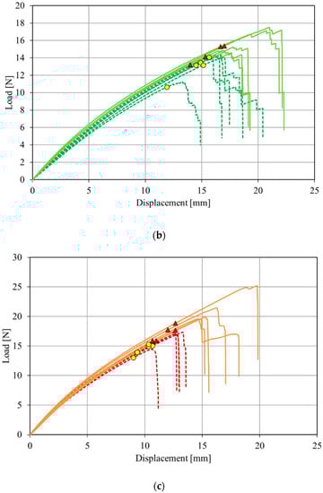 where Uc is the energy, the area under the stress-strain curve, up to the initiation point, and η is a geometry factor, previously calibrated for the dimensions used in this work (30 × 10 mm2) following the multispecimen procedure described in [,]. The η values are obtained from the following equation after measuring the actual a0 values from the fracture surfaces: