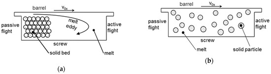 One of the main tasks of the plasticating extruder is to melt the polymer granulate. For a satisfactory melt quality, no solid particles must be present in the melt when it leaves the forming die. Therefore, a reliable description of the melting process is a necessary condition to ensure a successful process design. This section, therefore, deals with the two main models used to model the melting process: conventional and disperse melting. Both models use kinematic reversal, as described in [16] (see Figure 2). Here, the screw rotation is not considered to be kinematic, but the barrel is moved over the screw accordingly. This creates a corresponding relative system. For further simplification, the screw channel is not wound, but unwound. It lies flat in the plane, while the barrel wall moves over this plane. The speed components for the barrel wall result from the peripheral speed of the screw v0 and the pitch angle φ.