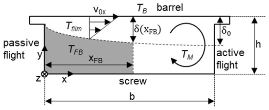 The melting process can now be represented by a melting mass flow ṁm as a function of the channel length z. This is based on the assumption that the melt film passes into the melt eddy at position x with a classical velocity profile of a drag flow, which results from the velocity transverse to the channel v0x (see Figure 4). Due to the triangular shape of this profile, the mean velocity profile can be assumed to be 0.5∙v0x. Furthermore, the correction factor k1 must be taken into account when considering the non-Newtonian flow behavior. This results in Equation (13).