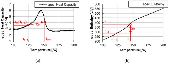 It should also be noted that in Equation (34), the specific heat capacity cp of the plastic is taken at a specific temperature T. This is unproblematic for materials with relatively unchangeable heat capacities above temperature, but semi-crystalline plastics have very variable specific heat capacities in the melting range. If only the value of the heat capacity at temperature T is chosen, it is possible that the temperature increase is greatly overestimated. In the following, a typical heat capacity profile and the resulting enthalpy profile of a semi-crystalline thermoplastic can be seen. Because of the peak in the heat capacity at the melting temperature of the polymer, more energy is required to heat up the polymer. This can also be seen in the slightly stronger increase of the enthalpy in the same temperature range. The increased required energy cannot be taken into account by means of a local, unchangeable heat capacity used in Equation (34).