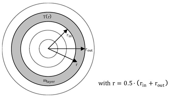 This can be done by a short calculation step. Therefore, the temperature increase of Equation (34) at interval i is used. With this temperature increase, the introduced energy can be calculated. At the start of the calculation, the particle is divided into 100 layers with an inner radius rin and an outer radius rout (see Figure 7).