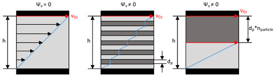 In the Brinkmann number, the consistency factor K is used. However, in the case of disperse melting, this cannot be assumed to be merely a consistency factor of the plastic melt. Rather, various publications [27,28,29,30] have shown that the solid particles distributed in the melt lead to an increase in shear, resulting in increased dissipation. This is described by a corrected consistency factor. The reason for the shear increase is that no shear occurs within the solid particle. This reduces the effective height at which the velocity gradient and thus the shear occurs. This is illustrated as a simplified example in the following figure. The solid particles are shown here as bars of thickness dp. This reduces the height h available for shearing to h − dp·nparticle. The shear therefore increases.