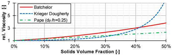 The models of Batchelor and Krieger and Dougherty clearly overestimate the viscosity at higher solids contents. However, this range is particularly relevant for disperse melting, since disperse melting is often initiated here. The model of Pape, on the other hand, matches the viscosities with an average deviation of 13% (PP) and 14% (LDPE) very well (see Figure 11), so that they can be used for the calculation of the corrected consistency factor.
