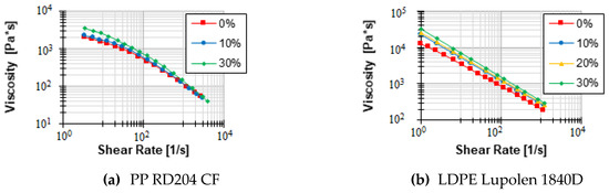 Viscosity above the shear rate for PP (a) and LDPE (b) and various solid contents.