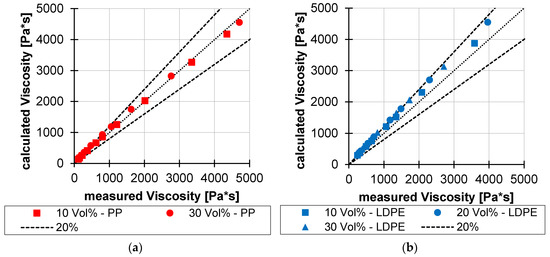 Comparison of measured and calculated viscosities of PP (a) and LDPE (b).