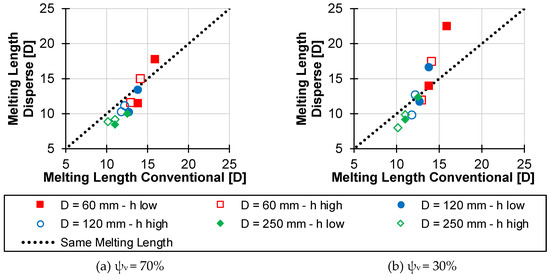Furthermore, it is relevant to know the temperature of the melt at the beginning of the disperse melting process, as this temperature has a significant influence on the disperse melting process. In the case of conventional melting, the model of Lakemeyer [25] can be used. This uses the dimensionless key figures Graetz (Gz) and Brinkmann (Br) to determine the temperature above the channel height in the melt eddy. For this purpose, the calculation is based on the conservation equation of energy.