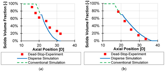 Comparison of measured versus simulated solids content for energy-transfer screw D = 30 mm with low back pressure (a,b) and high back pressure (c–e).