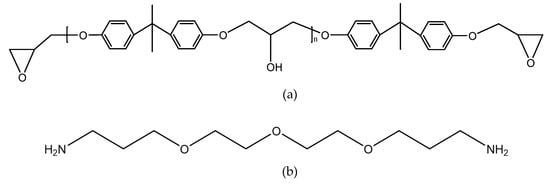 The joints were bonded by the two-component adhesive DP460 provided by 3M corporation. The component A of the adhesive mainly contains bisphenol A epoxy resin, while the component B mainly contains diethylene glycol bis (3-aminopropyl) ether, 2,4,6-tris (dimethylaminomethyl) phenol, and polyacrylic acid. The mix ratio of component A and component B is 2:1 by volume. At room temperature, the viscosity of the adhesive is 4.5 Pas, the worklife is 60 min, and the curing time is 4 h. The shear strength is 31 MPa according to the standard ASTM D 1002-72, the T-peel strength is 1071.5 Kg/m according to ASTM D 1876-61T, and the Bell Peel strength is 1375 Kg/m according to ASTM D 3167. The shore D hardness of the cured adhesive is 75–80 HD, and the coefficient of thermal expansion is 59 × 10−6/K. The structural formulas are shown in Figure 1, where the functional groups, reacting in the bonding process, are given.