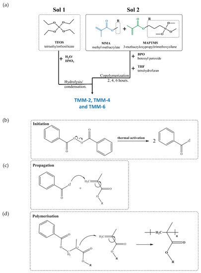 (a) Flow chart of the hybrid sol-gel preparation; (b) thermal initiation of benzoyl peroxide BPO; (c) propagation of the prepared radical; and (d) copolymerization of acrylate groups. R is the remainder of the MMA and MAPTMS molecules, marked by the dashed square in Figure 1a.