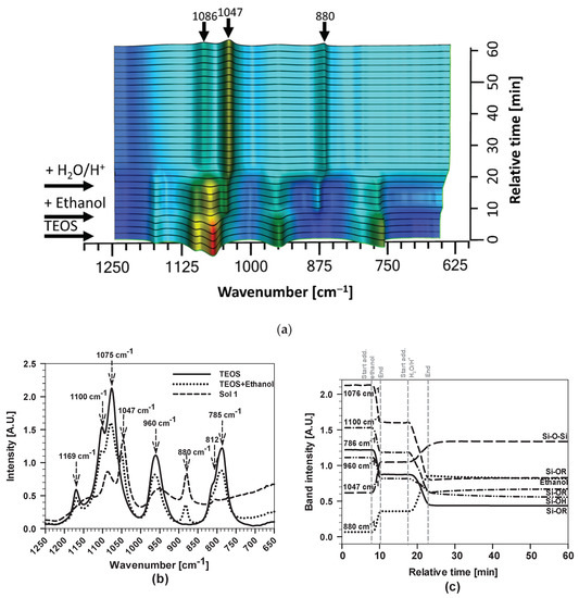 The process can be further analysed by comparing the characteristic band intensities as a function of time (Figure 2a,c). The first change in the bands’ intensities is due to dilution following the addition of ethanol and the second to the addition of H2O+/H+. The increase of the bands related to the Si–O–Si network (1047 and 1086 cm−1) occurred at the expense of the Si–O–R bands of TEOS at 1100, 1076 and 786 cm−1 and the band of Si–OH (at 960 cm−1) (Figure 2c). The latter is assigned to transverse optic modes, corresponding to different structural units with smaller siloxane, and larger Si–O–Si angles and Si–O bond lengths [32,59]. At the same time, the band at 880 cm−1, corresponding to ethanol, increased in intensity due to its formation as a side product of the hydrolytic condensation of TEOS. The existence of residual Si–O–R (at 1076 cm−1) and of Si–OH (at 960 cm−1) groups, even after 30 min of mixing, indicates that, although the sol was stabilised, the hydrolysis/condensation reactions were not complete at the end of the first stage of the synthesis process. During mixing, bands at 1047 and 1086 cm−1, related to the linear Si–O–Si chain, still increased (Figure 2a,c), whereas the broad band at 960 cm−1, related to Si–OH group, slowly decreased.