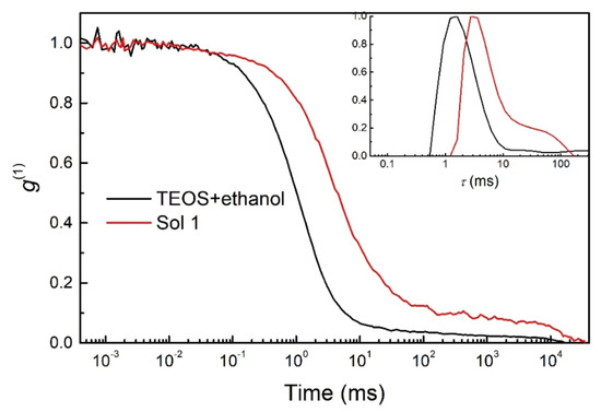 Autocorrelation functions (g(1)) as a function of delay time obtained by DLS showing the diffusion of species for TEOS+ethanol and TEOS+ethanol+H2O/H+ (Sol 1) after 30 min of hydrolysis/condensation process. Inset: The distribution of relaxation times (τ) showing significantly larger cluster size in Sol 1.