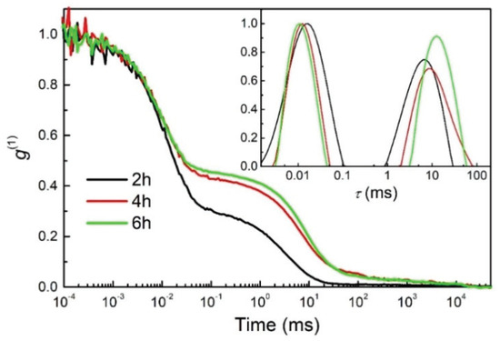 Autocorrelation functions (g(1)) as a function of delay time, measured by DLS, showing the copolymerization process of MMA/MAPTMS after various times: 2, 4, and 6 h. Inset: The distribution of relaxation times (τ) showing growth and consequent slowing of the diffusion of the clusters.
