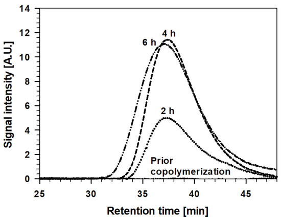 Gel permeation chromatograms of copolymerised MMA/MAPTMS prior to and after various copolymerization times: 2, 4 and 6 h.