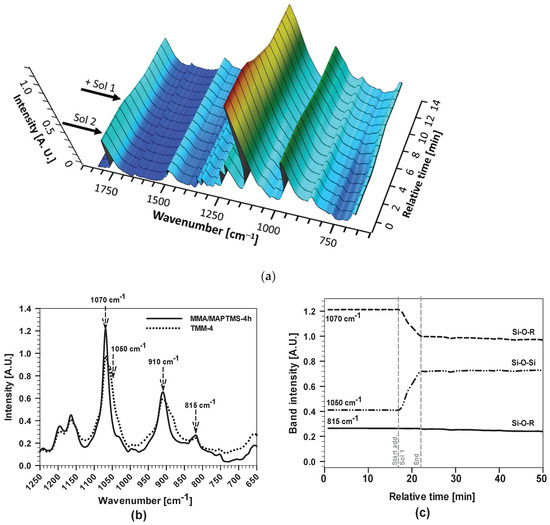 The intensities of characteristic bands as a function of time are presented in Figure 7c. The reaction took place rapidly, seen as a decrease of band intensity at 1070 and 815 cm−1 as well as the increase of the intensity of the characteristic band at 1050 cm−1. However, the intensities of the bands at 1070 and 815 cm−1 slowly decreased further due to the hydrolysis process of MAPTMS, and the band at 1050 cm−1 increased due to the formation of Si–O–Si bands. After 1 h, the intensities of the bands did not change with time, meaning that the stable TMM sol-gel was formed.