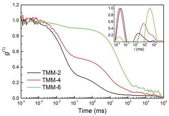 Autocorrelation functions (g(1)) as functions of delay time measured by DLS, showing the copolymerization process of TMM-2, TMM-4 and TMM-6. Inset: Distribution of relaxation times (τ) showing growth and consequent slowing of the diffusion of the clusters.