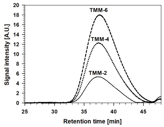 Gel permeation chromatograms for the TMM-2, TMM-4 and TMM-6 solutions are presented in Figure 9.