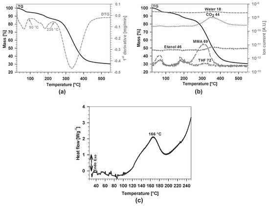 Coupled thermogravimetric Analysis/Mass Spectrometry measurements (TG-MS) were performed for TMM-4 on a Mettler Toledo TGA/DSC1 instrument connected to a Pfeiffer Vacuum ThermoStar mass spectrometer. About 3 mg of the sample were placed into a 150 µL platinum crucible and heated at a rate of 10 °C min−1 from 25 to 550 °C. During the measurement, the furnace was purged with air with a flow rate of 50 mL min−1. The empty crucible served as a reference. The blank curve was subtracted. Evolved gases were introduced into the mass spectrometer via the 75-cm long heated capillary.
