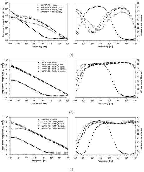 EIS results for uncoated AA7075-T6 and coated with TMM-2, TMM-4, and TMM-6 coatings immersed for 1 h in dilute Harrison’s solution presented as Bode plots of: (a) impedance magnitude; and (b) phase angle.