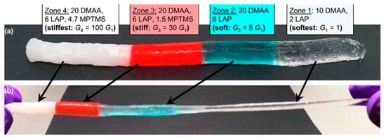Variations of the soft−stiff hybrids: (a,b) multizone cylinders. (a) The gel has four zones, with zone 1 on the far right being the softest, with a shear modulus G1 ≈ 1 kPa and zone 4 on the far left having a modulus ~100 G1. Between these, there are two more zones, each colored with a different dye and having intermediate moduli, as indicated. Zones 1 and 2 are prepared without methacrylated silane (MPTMS) and are transparent, whereas zones 3 and 4 have MPTMS and are opaque. (b) The cylinder is stretched to show that zones 3 and 4 are negligibly extended, zone 2 is extended as it, and zone 1 is extended a lot. Reprinted from [5] with permission.
