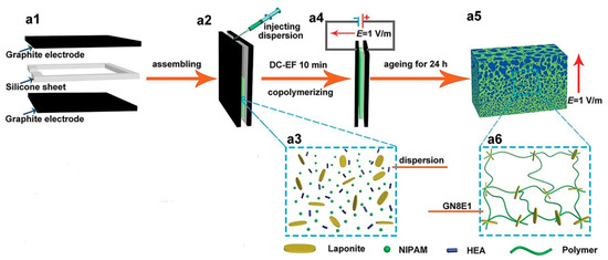 Tan et al. used an electrophoresis technique to move charged components, thus creating a gradient structure [7]. Their hydrogels were prepared by copolymerizing hydroxyethyl acrylate and N-isopropylacrylamide monomers. Negatively charged laponite particles were dispersed in the monomer solution and used as electrically active components. Gelation was realized between two graphite electrodes separated by a silicone frame spacer. During the copolymerization of the monomers, a direct current electric field was applied to the electrodes, which caused the charged laponite particles to move towards the anode, resulting in a gradient gel structure. Scheme of synthesis of the bionic gradient hydrogel is shown in Figure 2.