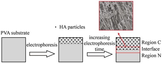 The electrophoresis method was combined by Su et al. with directional freezing-thawing to synthesize bilayered poly(vinyl alcohol) (PVA)/hydroxyapatite composite hydrogels with anisotropic and gradient mechanical properties [11]. Hydroxyapatite nanoparticles were used to overcome the very low cell adhesion on PVA hydrogels, which otherwise can be widely used for biomedical application, especially in the field of tissue engineering. Further, the nanoparticles enhance the mechanical strength of the hydrogel scaffold. Initially, PVA hydrogels were prepared by the directional freezing-thawing, which created an aligned channel structure. This was achieved using liquid nitrogen, which formed a temperature gradient inside the hydrogel, thus inducing the growth of ice crystals along the temperature gradient and pushing the PVA molecules aside. During the following thawing process, PVA chains formed crystallites, which provide the structural stability, as well as the elasticity of the hydrogel. Additional directional freezing–thawing cycles induced a further increase in channel size. Subsequently, during electrophoresis in calcium chloride and disodium hydrogen phosphate solution, hydroxyapatite particles were formed within the channels and distributed uniformly. By controlling the duration of the electrophoresis procedure, a bilayered hydrogel with half-composite and half-non-composite regions could be synthetized. Illustration of the electrophoresis process published by Su et al. is illustrated in Figure 3.