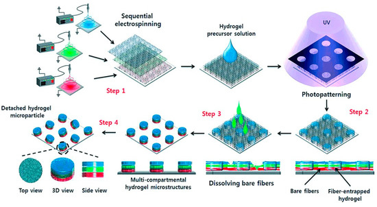 Cho et al. described a combination of electrospinning and photopatterning as a technique for fabricating multi-compartmental non-spherical hydrogel microparticles [12]. The electrospinning was realized as a sequential process which allows the production of multi-layered fiber hydrogel scaffolds with distinct compositions in each layer, which is basically a compartment of the microparticle. The whole procedure is illustrated in Figure 4.
