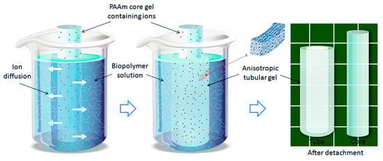 Mredha et al. suggested the fabrication of anisotropic tubular hydrogels by the controlled diffusion of small ions as gelators [15]. The method is shown in Figure 5.