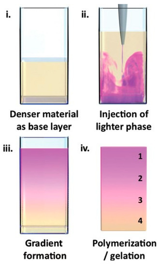 Buoyancy-driven gradient casting. The gradient pattern could be tuned by varying the injection rate and concentration of sucrose in the base layer. Reprinted from [24] with permission.