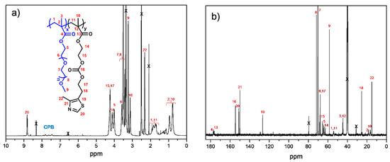 (a) 1H and (b) 13C nuclear magnetic resonance (NMR) spectra of the copolymer with a PEGMA/MTZ ratio of 50/50.