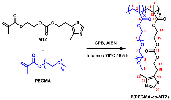 Reversible addition-fragmentation chain transfer (RAFT) copolymerization reaction of 2-(((2-(4-methylthiazol-5-yl)ethoxy)carbonyl)oxy)ethyl methacrylate monomer (MTZ) and poly(ethylene glycol) methyl ether methacrylate (PEGMA): preparation of P(PEGMA–co–MTZ) copolymers. CPB, 2-cyano-2-propyl benzodithioate; AIBN, 2,2’-Azobisisobutyronitrile.