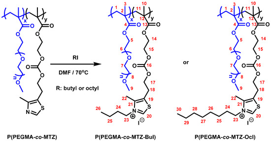 Quaternization reaction to prepare P(PEGMA–co–MTZ-BuI) and P(PEGMA–co–MTZ-OcI) cationic copolymers. DMF, N,N-dimethylformamide.