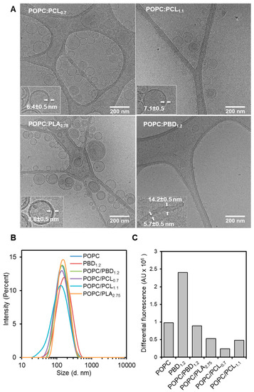 BCPs or POPC/BCPs mixtures at equimolar ratios were used to prepare large unilamellar vesicles (LUVs) by the solvent dispersion and extrusion method, followed by morphological characterization using cryogenic-transmission electron microscopy (cryo-TEM) and dynamic light scattering (DLS). The electron micrographs showed a radially uniform density distribution as well as the Fresnel interference fringes on the inner and outer membrane edges, suggesting topographically uniform vesicles were obtained [34] (Figure 1A). Line profile measurements estimate the bilayer thicknesses of 6.4 ± 0.6 nm, 7.1 ± 0.6, 8.8 ± 0.6, and 5.7 ± 0.6 nm for POPC/PCL0.7, POPC/PCL1.1, POPC/PLA2.75, and POPC/PBD1.2, respectively. For POPC, 5.3 ± 0.5 nm was obtained. For POPC/PBD1.2, in addition to the vesicular structure, cylindrical tubes with a diameter of about 14 nm were also observed, which is consistent with previous studies [34]. A closer inspection on the density distribution reveals a clear midplane of low density for POPC/PCL0.7 and POPC/PCL1.1 that is less distinct for POPC/PLA2.75, suggesting chain overlap (interdigitation) as well as chain entanglement. In contrast, polydisperse and non-uniform assemblies were observed for the BCPs (Figure S1). PCL0.7 and PCL1.1 formed worm-like micellar structures with a diameter of about 12 nm (Figure S1A,B), whereas PLA2.75 formed polydisperse assemblies comprising of micelles and vesicle-like morphology with a membrane thickness of about 17 nm (Figure S1C).