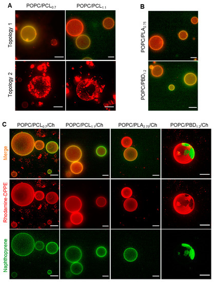 A phase separated surface topology was observed readily for POPC/PBD1.2/Ch, where Rhod-DPPE (red in color) and naphthopyrene (green in color) partitioned into mutually exclusive regions (Figure 2C). Green spherical polymer-rich domains were surrounded by interconnected lipid phase, an effect of line tension minimization on a de-mixed fluid phase bilayer [23,47] and a result of lipid chain-ordering effect of cholesterol [23,35]. The biodegradable hybrid GUVs showed homogenous surfaces. For POPC/PCLs/Ch and POPC/PLA/Ch, Rhod-DPPE-dense or excluded regions observed for the cholesterol-depleted GUVs were replaced by a homogeneous one, suggesting that the nanometer-sized defects that may have contributed to dye accumulation (Figure 2A) have vanished in the presence of cholesterol, consistent with the fluidizing effect of cholesterol observed in other studies [23,43].