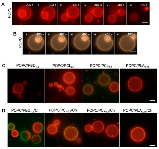 Hybrid giant unilamellar vesicles prepared by electroformation observed using wide-field fluorescence microscopy. (A) 1-palmitoyl-2-oleoyl-sn-glycero-3-phosphocholine (POPC)/polycaprolactones (PCLs). (B) POPC/polylactic acid (PLA2.75) and POPC/polybutadiene (PBD1.2). (C) POPC/BCP/cholesterol (Ch) (1:1:1) labeled with 0.5–1.0 mol% of 1,2-dipalmitoyl-sn-glycero-3-phosphoethanolamine-N-(lissamine rhodamine B sulfonyl) (Rhod-DPPE) and 1.0–1.5 mol% Naphthopyrene. Scale bars, 10 μm.