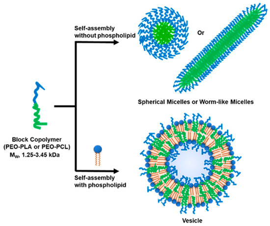 - Khan, S.; McCabe, J.; Hill, K.; Beales, P.A. Biodegradable hybrid block copolymer—Lipid vesicles as potential drug delivery systems. J. Colloid Interface Sci. 2020, 562, 418–428. [Google Scholar] [CrossRef] [PubMed]