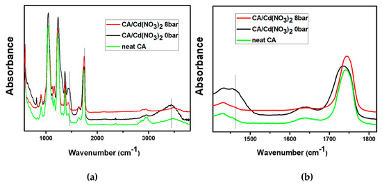 FT-IR spectra of neat CA and 1/0.35 CA/Cd(NO3)2·4H2O polymer matrix at 0 bar and 8 bar water pressures: (a) total range and (b) enlarged specific region.