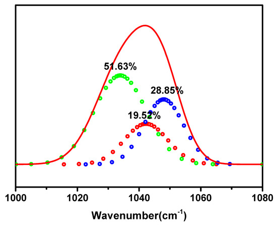 When Cd(NO3)2 was incorporated to the polymer, the peak was shifted from 1051.5 to 1040 cm−1 and was broadened as shown Figure 5, indicating that the Cd(NO3)2 incorporated into the CA polymer existed as free ions and ion pairs as well as aggregates. In the case of the Cd(NO3)2 incorporated into the CA, the relative percentages for various ionic species were shown in Figure 6. Surprisingly, new peaks were observed at 1034.2 and 1045.6 cm−1, indicating the free ions and ion aggregates. Deconvoluted results were shown for each of the regions in Figure 6.