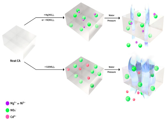 To date, porous materials have been formed through a variety of methods such as thermally induced phase separation, evaporation induced phase separation, phase inversion and track-etching [20,21,22]. For example, Jian Zhao et al. proposed a method to fabricate microporous material using the solvent evaporation-including separation. This method used a ternary solution, such as a liquid silicone rubber precursor of liquid paraffin and hexane, and this solution was cast to form a film. When the hexane and liquid paraffin was removed, micropores from less than 300 to over 1200 µm were generated in the silicone rubber film [23]. Hermsdorf et al. suggested the fabrication of porous polyimide film onto a silicon support coated with an oxide layer. Polyimide membranes are used as a starting material for a sample preparation based on the high energy of ion irradiation. As a result, the pore size in the membrane was an average of 73 nm and the pore shape was conical [24]. However, some problems of these methods are the complications and the high-cost of the process. To solve these drawbacks, our group reported the method to fabricate pores using the ionic liquid and solvated inorganic complex [25,26]. The nickel nitrate (Ni(NO3)2·6H2O) as inorganic complex was well dissolved in water or acetone and it can be applied to cellulose acetate solution dissolved acetone/water (w/w 8/2). As a result, the pore size and volume of the polymer matrix increased by water pressure and the pores were uniformly distributed [26]. In this study, we suggested the environment-friendly and energy-efficient method to synthesize the pores, which is close to the straight type in a cellulose acetate (CA) polymer matrix [27], using a combination of inorganic complex (Cd(NO3)2·4H2O) and isostatic water pressure. Especially, we investigated the effect of the ionic radius in metal nitrate on both the pore generation and pore control of cellulose acetate.