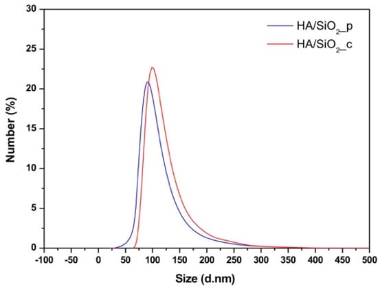 The nanoparticle size of both hybrid samples was also confirmed by DLS investigations. Figure 3 reports the size distribution of both SiO2/HA_p and SiO2/HA_c nanoparticles.