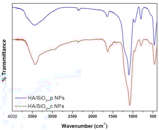 FT-IR spectra of SiO2/HA_p and SiO2/HA_c hybrid NPs.
