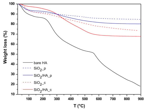 In order to confirm the presence of the HA component in the hybrid system, Thermogravimetric Analysis (TGA) measurements were carried out, and the thermal behavior of the SiO2/HA samples was compared with those of pure HA and bare SiO2 nanoparticles. The resulting TGA curves are reported in Figure 5. The TG curve of pure HA showed a first weight loss below 150 °C (10 wt %) related to the release of physically adsorbed water, and that above 250 °C was attributed to the oxidative decomposition of both labile and recalcitrant components [].