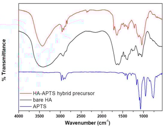 FT-IR spectra of APTS, bare HA and the HA-APTS hybrid precursor.