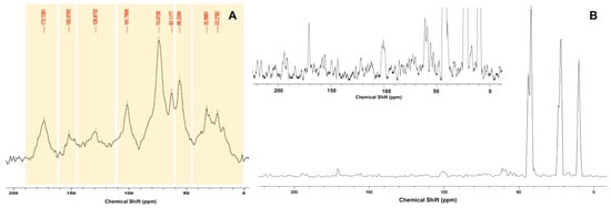 In order to further support the FT_IR results, an NMR investigation was carried out. Figure 7 reports the 13C CPMAS NMR spectra of pure HA (Figure 7A) and the HA-APTS hybrid precursor (Figure 7B).