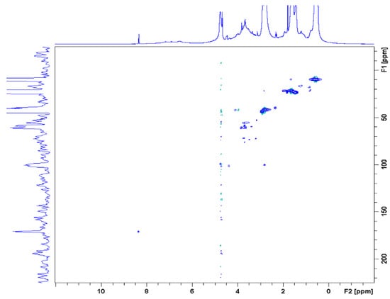 A comparison of the results obtained by 13C CP/MAS spectrum and two-dimensional 1H-13C HSQC, reported in Figure 8, revealed the presence of a signal at 170/9 ppm, supporting the formation of an amide bond between the carboxyl groups of HA and amine groups of APTS, in accordance with the FTIR results (Figure 6).