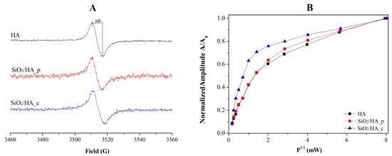 On the other hand, a great ΔB increase (~1.2 G) was observed for the SiO2/HA_c sample, indicating that the chemical coupling, due to the APTS use during the synthesis, strongly influenced the local organization of the humic macromolecules, in which the radical centers appeared closer within the hybrid nanoparticles. This behavior was also confirmed by the power saturation curves, reported in Figure 9B and obtained by plotting the normalized peak amplitude (A/A0) of spectra recorded while increasing the incident microwave power (P) as a function of the square root of P itself. In all cases, a monotonic trend was observed, indicating that the free radical spins did not exhibit the same relaxation times and saturated independently.