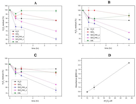 Antioxidant properties of SiO2, SiO2/HA_p and SiO2/HA_c NPs and pure HA at different hydrogen peroxide concentrations: (A) 10 μM, (B) 12.5 μM and (C) 25 μM; (D) standard calibration curve for hydrogen peroxide determination.