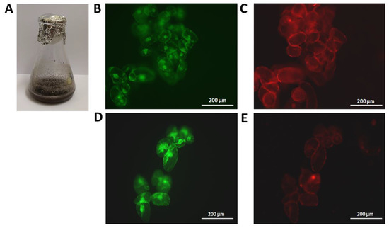 Cell viability (assessed with fluorescein diacetate and propidium iodide as described in Materials and Methods). (A) Cell growth observed in a flask containing V. vinifera suspension-cultured cells treated with 15 g/L carboxymethyl-β-cyclodextrins-epichlorohydrin (CM-CDs-EPI-MN) + methyl jasmonate (MJ). (B) Vitis vinifera cells (which have been elicited with 15 g/L carboxymethyl-β-cyclodextrins-epichlorohydrin (CM-CDs-EPI-MN) + 100 µM methyl jasmonate (MJ)) treated with fluorescein diacetate probe. (C) Vitis vinifera cells (which have been elicited with 15 g/L CM-CDs-EPI-MN + 100 µM MJ) treated with propidium iodide probe. (D) Vitis vinifera cells (which have been elicited with 15 g/L hydroxypropyl-β-cyclodextrins-epichlorohydrin (HP-CDs-EPI-MN) + 100 µM methyl jasmonate (MJ)) treated with fluorescein diacetate probe. (E) Vitis vinifera cells (which have been elicited with 15 g/L hydroxypropyl-β-cyclodextrins-epichlorohydrin (HP-CDs-EPI-MN) + 100 µM methyl jasmonate (MJ)) treated with propidium iodide probe. All images were taken at 144 h of treatment.