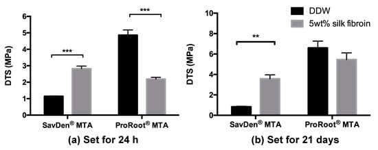 The diametral tensile strength (DTS) value of mineral trioxide aggregate (MTA) cements set by DDW and silk fibroin solution after (a) 24 h setting and (b) 21 days setting. ** Indicates a significant difference (p < 0.01). *** Indicates a significant difference (p < 0.001).